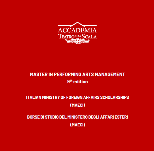 Il Ministero degli affari esteri e della cooperazione internazionale finanzia 9 borse di studio per l’a.a. 2023-2024 per il Master in “Performing Arts Management” presso l’Accademica d’Arti e Mestieri dello Spettacolo Teatro alla Scala, istituzione formativa nei settori dello spettacolo rinomata su scala globale. Il bando chiuderà il 14 settembre 2023 per i candidati di paesi extra UE e il 5 ottobre 2023 per i candidati dell’Unione Europea. Per maggiori informazioni è possibile consultare il bando.